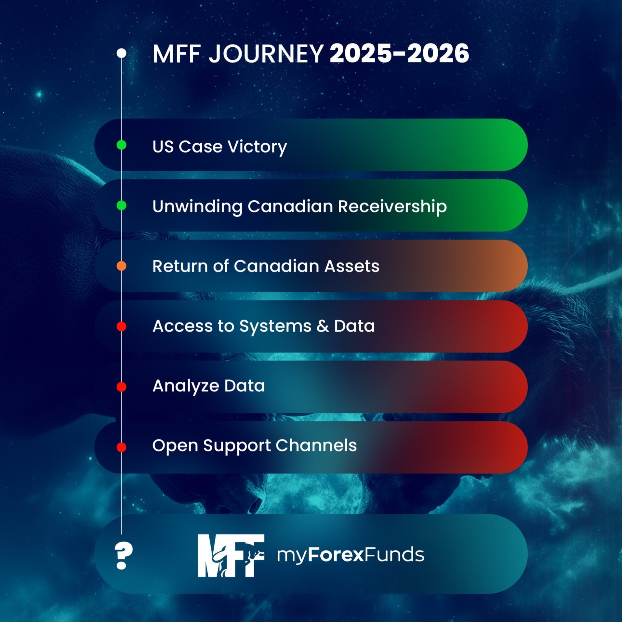 We're excited to share another major milestone on our journey — Phase Three is officially complete. The Ontario Superior Court has approved the Canadian Asset Handover Order. We are in the process of regaining full control over our assets, data, and systems. The phase of reassembling the MyForexFunds team can now begin. With the right people back in place, a comprehensive analysis and operational review will follow, bringing us one step closer to the next chapter for MyForexFunds and our global trading community.